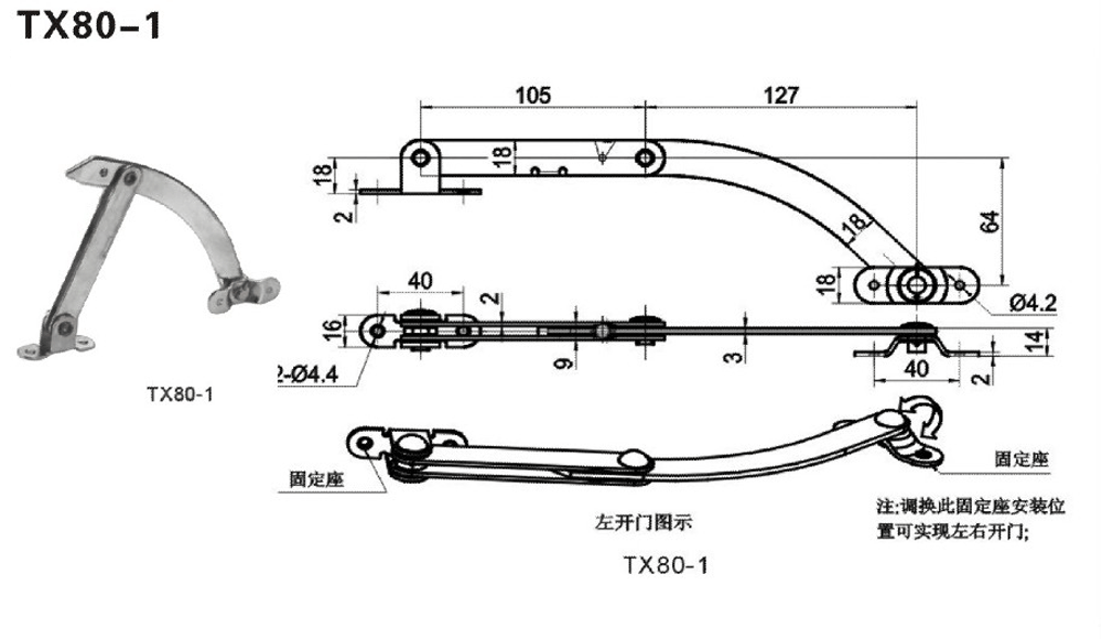 【產品描述】本限位裝置主要用于電柜固定開門角度之用,以彈子定位結構牢固,開啟角度135度,分左右開門。大小分兩種