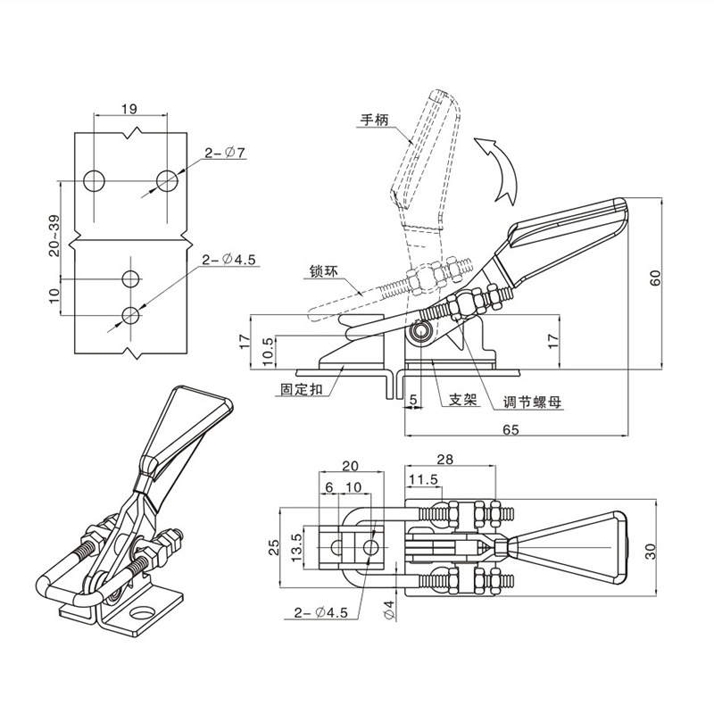 材質及表面處理:鍍鋅鋼、不銹鋼扣體,把手帶塑料套;