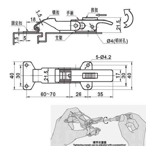 結構功能:翻蓋式搭扣;翻蓋通過按扭固定;通過調節螺桿可控制扣緊力;